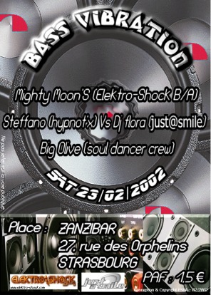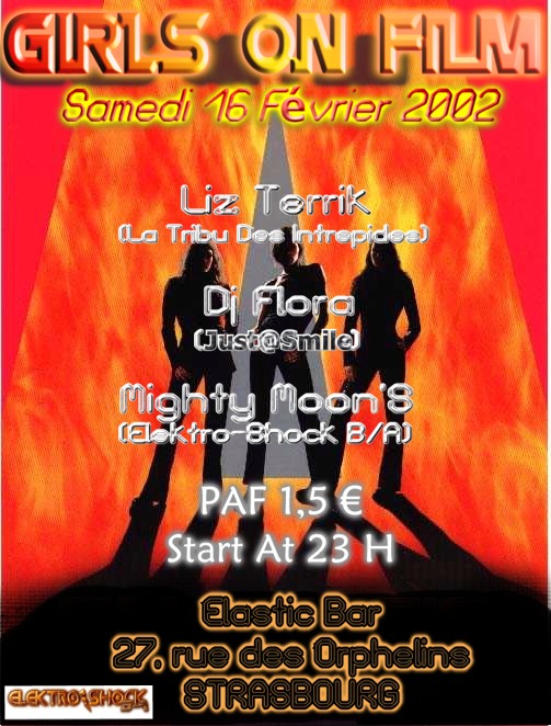 "Girls On Film" à l'Elastic 27, rue des Orphelins 03 88 36 11 10 EnTREE 1,5 euros - Liz Terrik (La Tribu Des Intrépides) - Flora (Just@Smile) - Mighty Moon'S ( Elektro-Shock B/A ) 23 FEVRIER 2002 Bass Vibration Au Zanzibar 27, rue des Orphelins